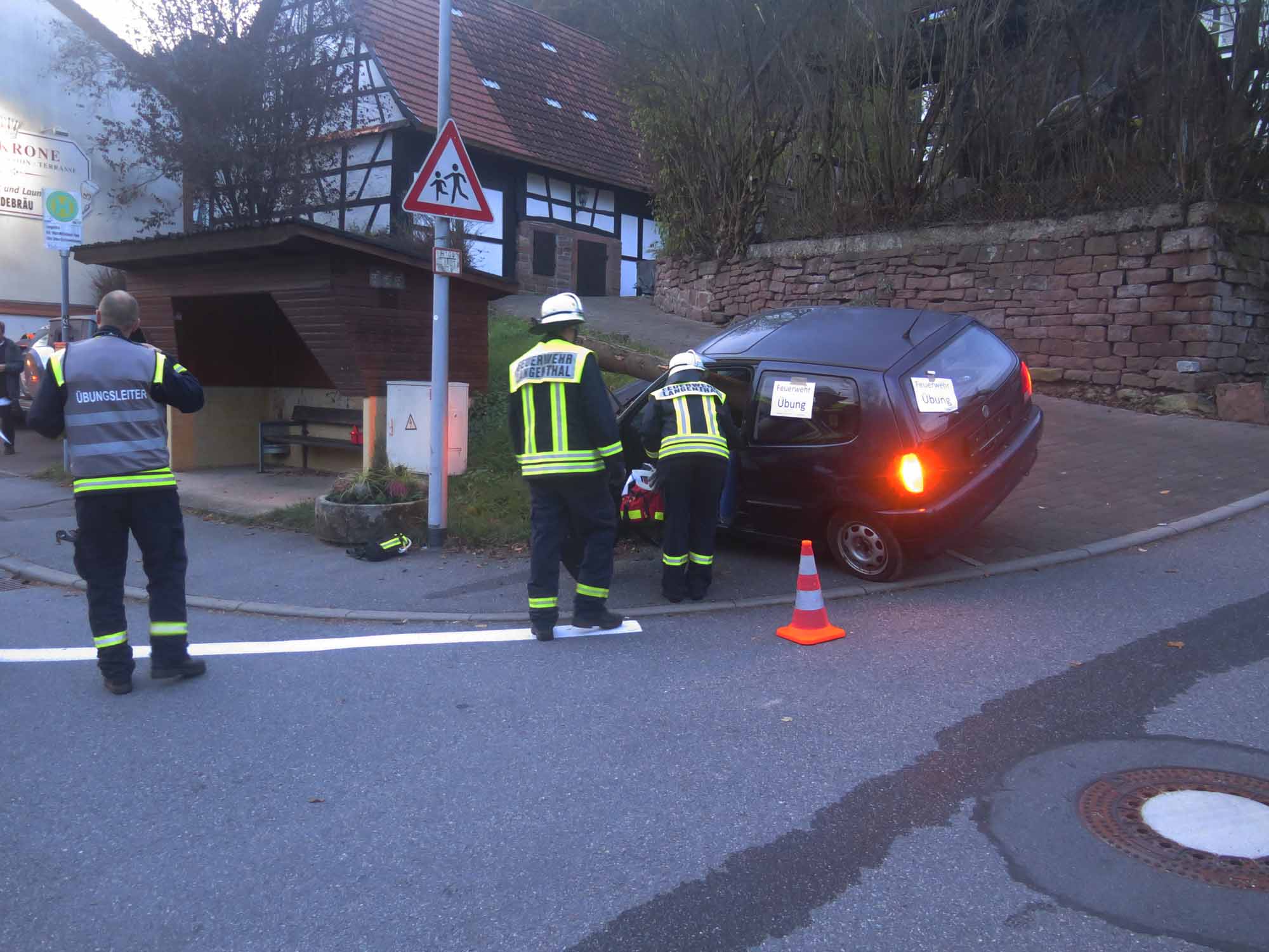 Wenige Minuten nachdem die Alarmierung durch die Leitstelle Bergstraße erfolgte, trafen auch schon die ersten Fahrzeuge am inszenierten Unfallort ein, sogleich begann der erste Gruppenführer die Erkundung. Die Übungslage stellte sich wie folgt dar; Ein verunfallter PKW mit drei Personen, eine Person davon eingeklemmt zwischen Fahrersitz und einem Baumstamm, der sich während des Unfallablaufes durch die Windschutzscheibe bohrte.