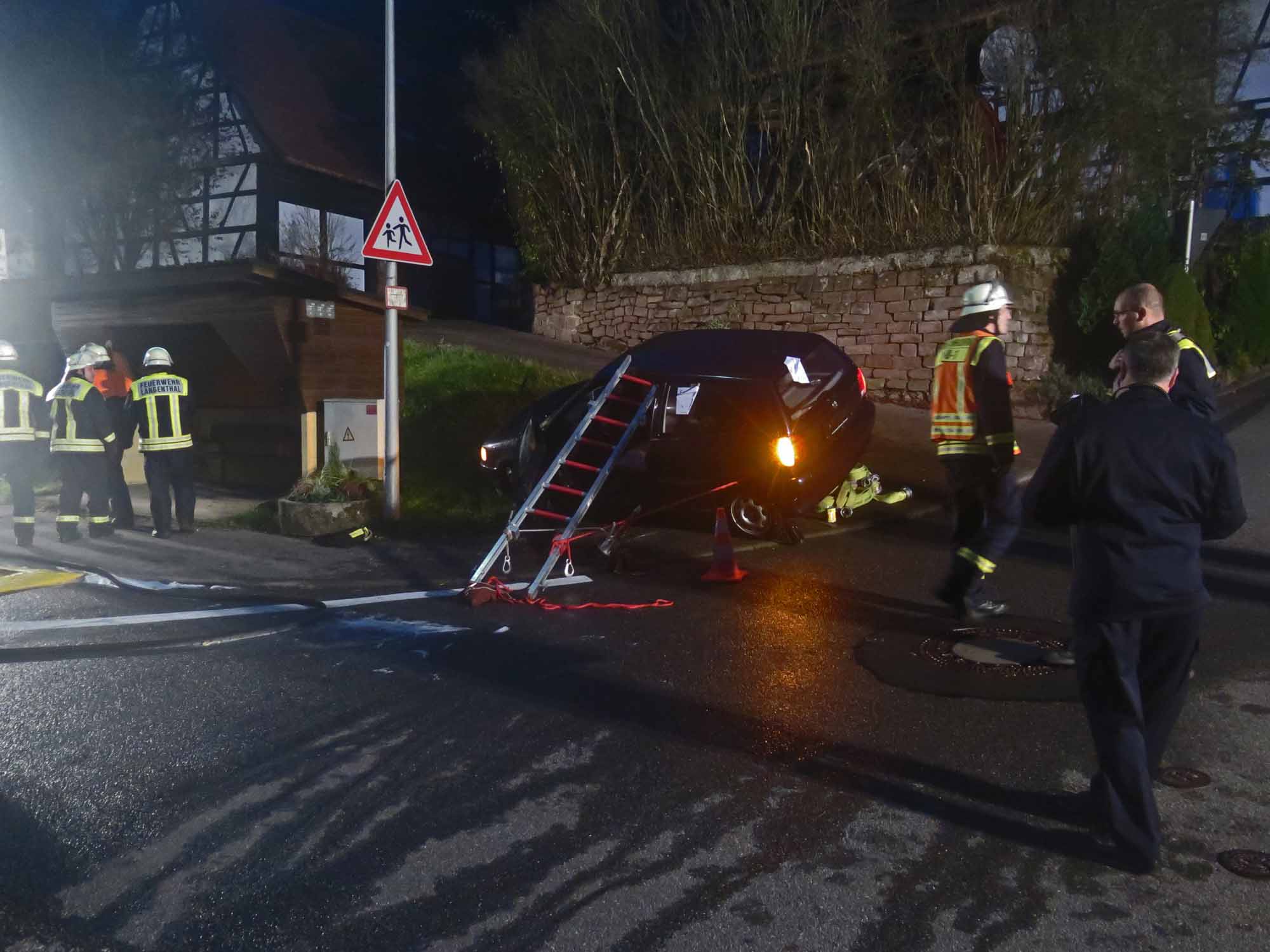 Der Gruppenführer erhielt nach der ersten Erkundung und der Einleitung erster Maßnahmen zur Personenrettung Unterstützung durch den Eisatzleiter M. Siefert. In Absprache des gebildeten Führungsteams gelang es die Lage soweit abzuarbeiten, dass die nicht eingeklemmten Personen schnell dem Rettungsdienst übergeben werden konnten und die mittels Baumstamm eingeklemmte Person mit der Motorkettensäge befreit werden konnte. Noch während der Rettung der letzten Person aus dem verunfallten Fahrzeug fing dieses mit einer starken Rauchentwicklung an zu brennen. Auch diese Situation konnte umgehend durch den standardmäßig bereitstehenden Brandschutz unter Kontrolle gebracht werden, so dass die Lage bereits 20 Minuten nach dem Eintreffen der ersten Fahrzeuge vollständig abgearbeitet war.